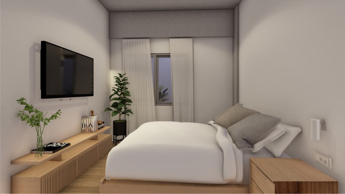 Dispone de estar, cocina comedor, dormitorio, antebaño y baño completo. Una propuesta moderna, funcional y con gran protagonismo del espacio al aire libre.