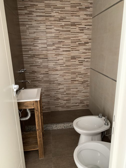 -Baños con revestimiento moderno en dos tonos de cerámica con guardas de acero inoxidable, ducha con receptáculo.