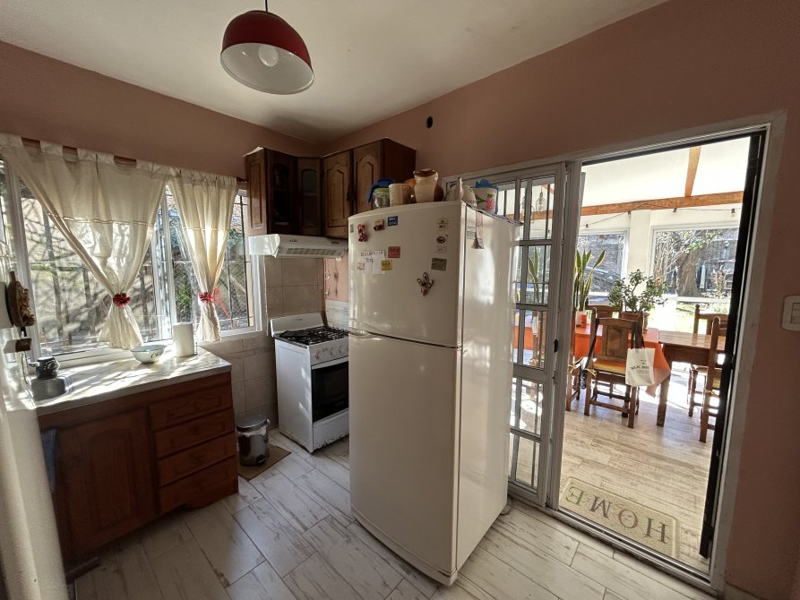Consta de gran jardin al frente, garage pasante para varios vehiculos, amplio living comedor, cocina equipada con muebles bajo mesada y alacena, galeria amplia y luminosa con ventanales al fondo, 2 dormitorios con piso de parquet, ambos con piso de parquet, baño completo con ducha reciclado a nuevo y fondo libre con un galpon de 35 m2 con baño.
